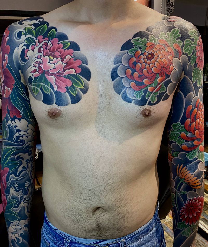 当前位置: 首页 >重庆市纹身店-歸刺青纹身图案>双花臂带半胛纹身图片_手部手臂老传统新传统花臂菊花牡丹纹身图案