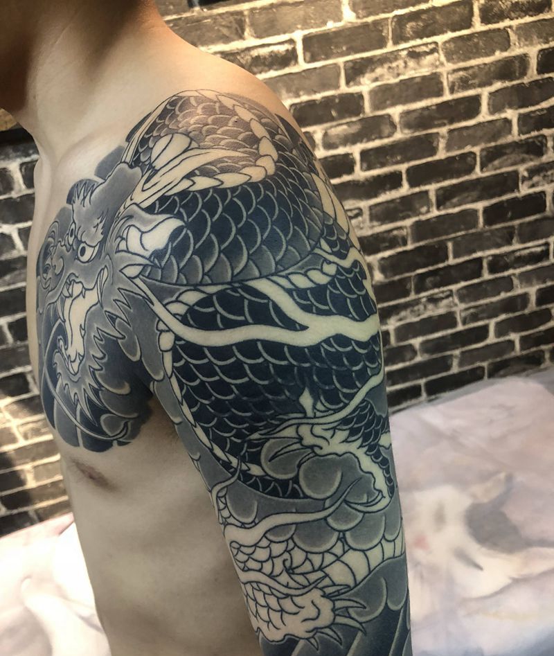 恢复后,未完纹身图片_手臂手部老传统龙半胛纹身图案