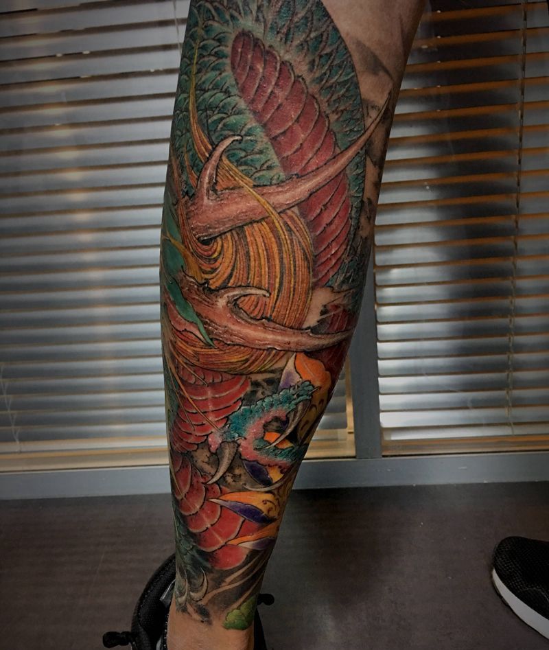 • T网红王老大花腿龙纹身图片_腿部新传统纹身图案