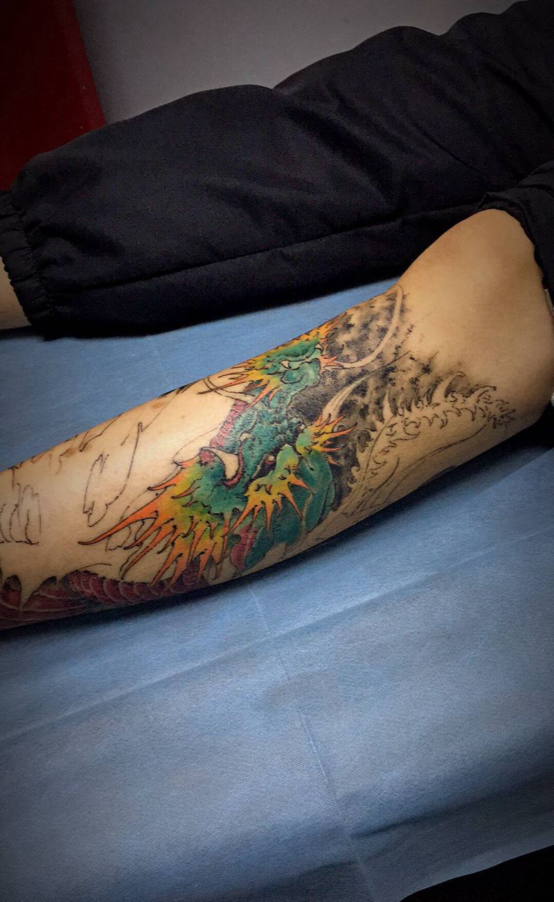 • T网红王老大花腿龙纹身图片_腿部新传统纹身图案