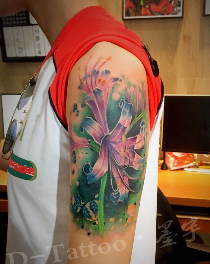 彼岸花遮盖作品纹身图片_刺青匠重庆重庆店成品手臂静物植物纹身图案