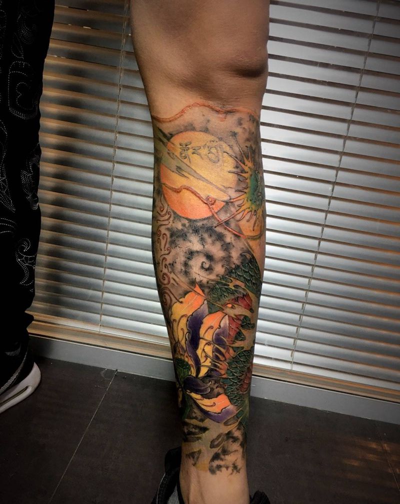 • T网红王老大花腿龙纹身图片_腿部新传统纹身图案