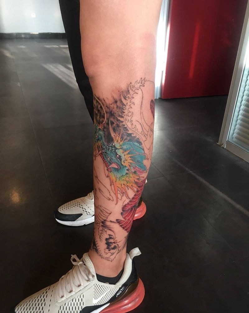 • T网红王老大花腿龙纹身图片_腿部新传统纹身图案