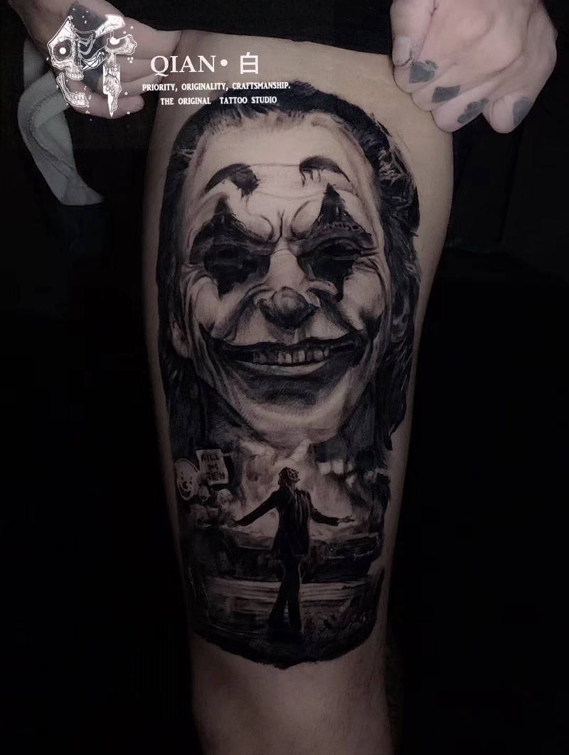 小丑纹身图片_腿部欧美写实纹身图案