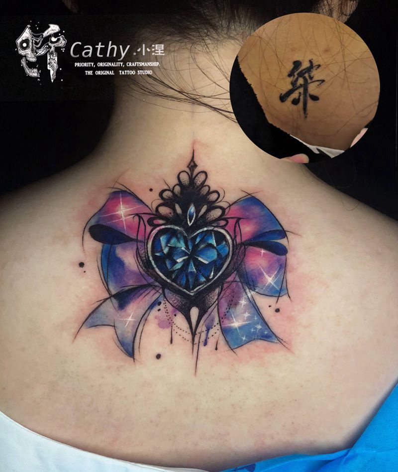 蝴蝶结纹身图片_背部水彩遮盖原创纹身图案