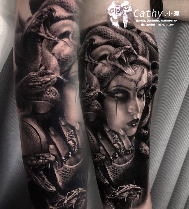 原创美杜莎纹身图片_手臂欧美写实重庆原创设计黑灰写实纹身图案