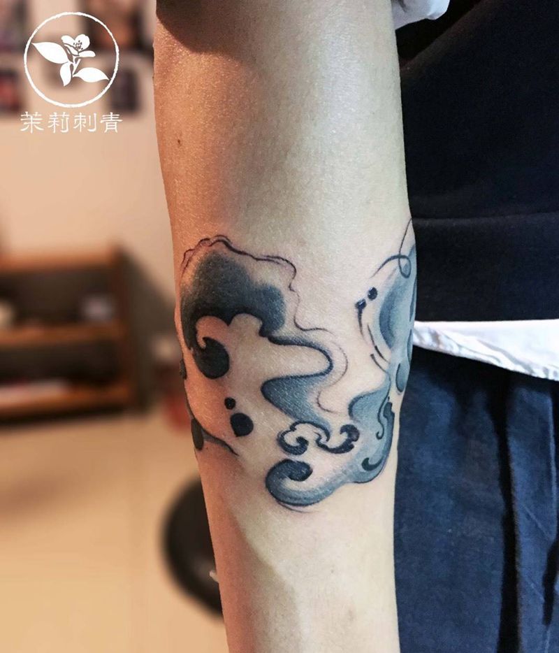祥云纹身图片_成品手臂传统黑灰水墨纹身图案