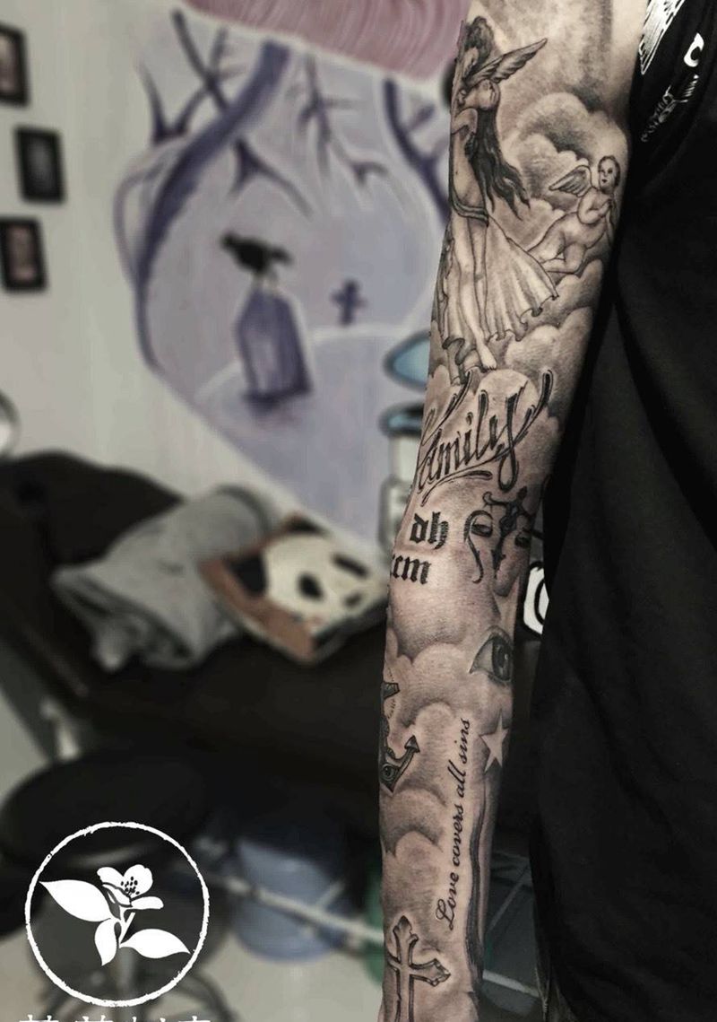 当前位置: 首页 >重庆市纹身店-茉莉刺青纹身图案>欧美拼接花臂纹身图片_手臂手稿成品欧美纹身图案
