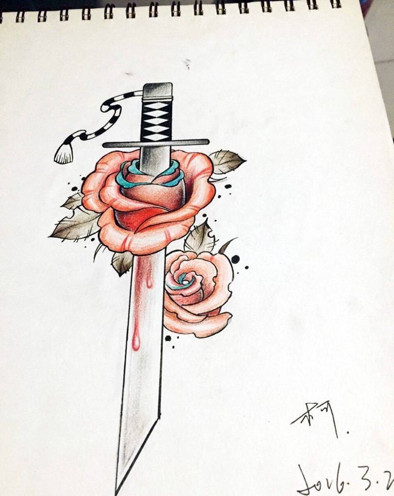 匕首 玫瑰纹身图片_手稿成品手臂欧美植物纹身图案
