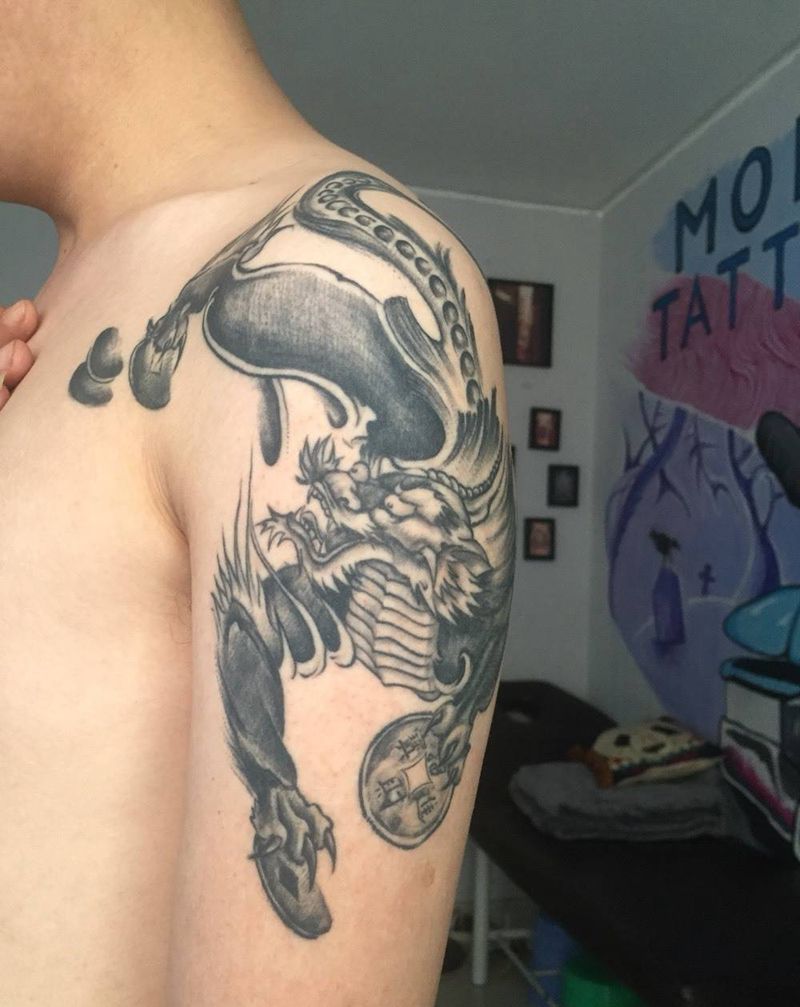 • T网红王老大花腿龙纹身图片_腿部新传统纹身图案