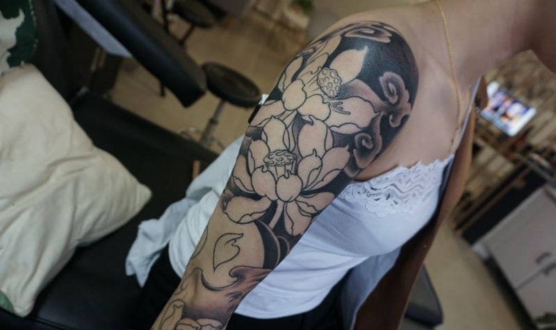 莲花花臂未完纹身图片_手臂新传统水彩纹身图案