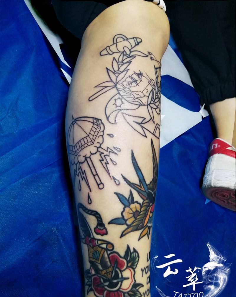 • T网红王老大花腿龙纹身图片_腿部新传统纹身图案