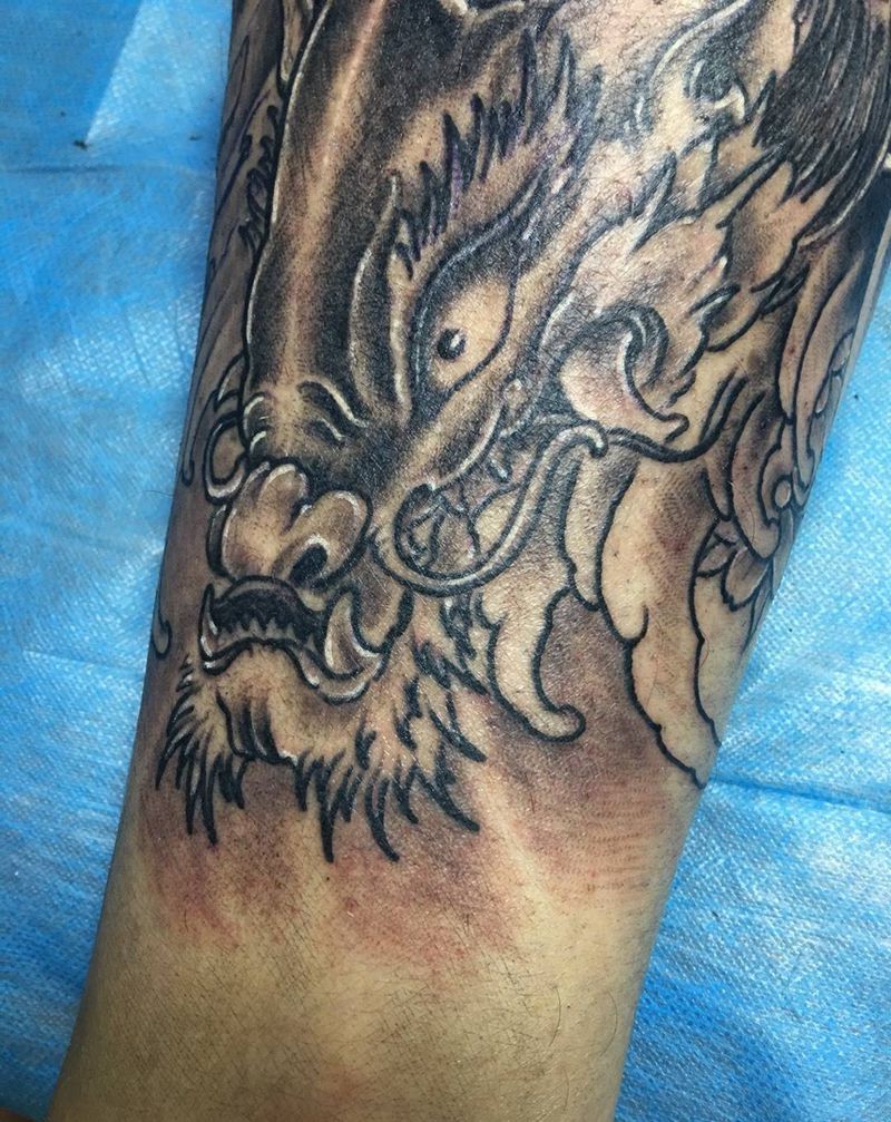 • T网红王老大花腿龙纹身图片_腿部新传统纹身图案