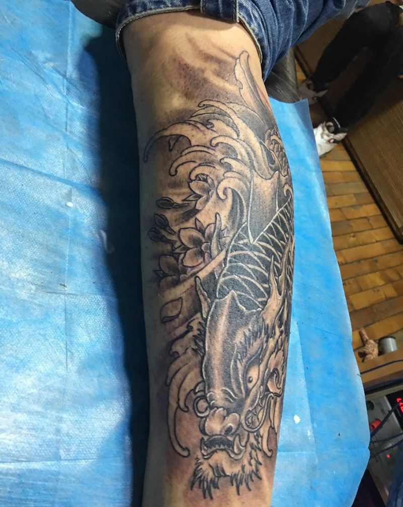• T网红王老大花腿龙纹身图片_腿部新传统纹身图案