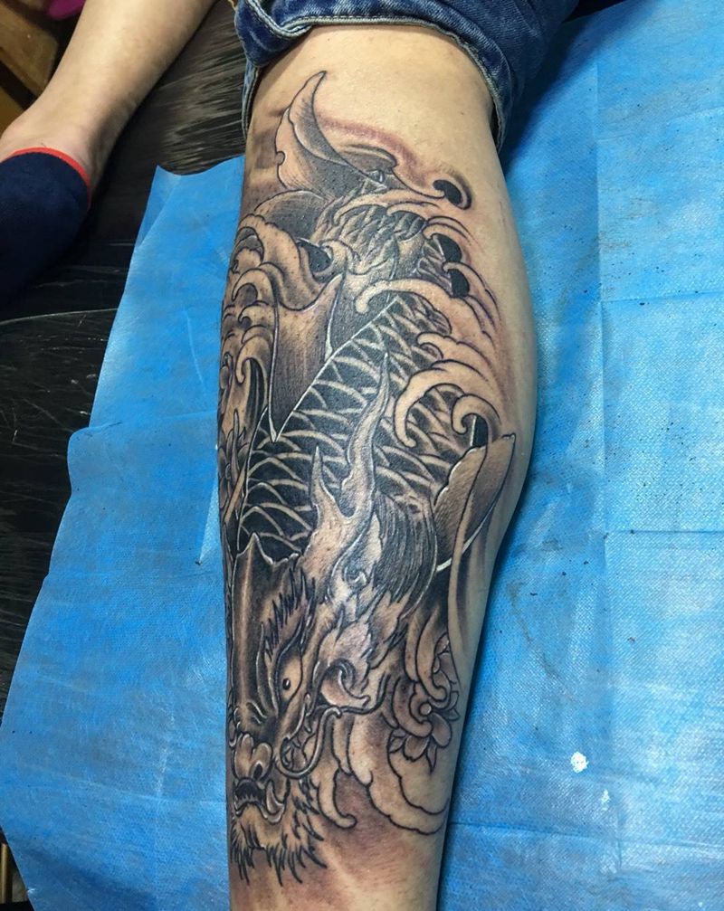 • T网红王老大花腿龙纹身图片_腿部新传统纹身图案