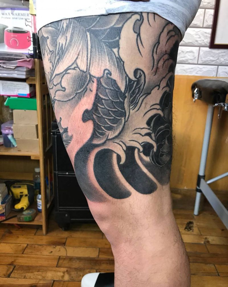 • T网红王老大花腿龙纹身图片_腿部新传统纹身图案