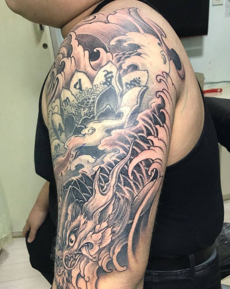 • T网红王老大花腿龙纹身图片_腿部新传统纹身图案