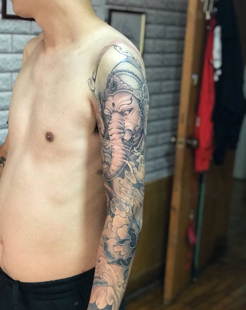 当前位置: 首页 >重庆市纹身店-北彫刺青纹身图案>象神花臂纹身图片