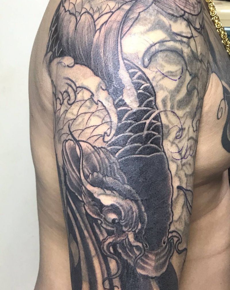 • T网红王老大花腿龙纹身图片_腿部新传统纹身图案