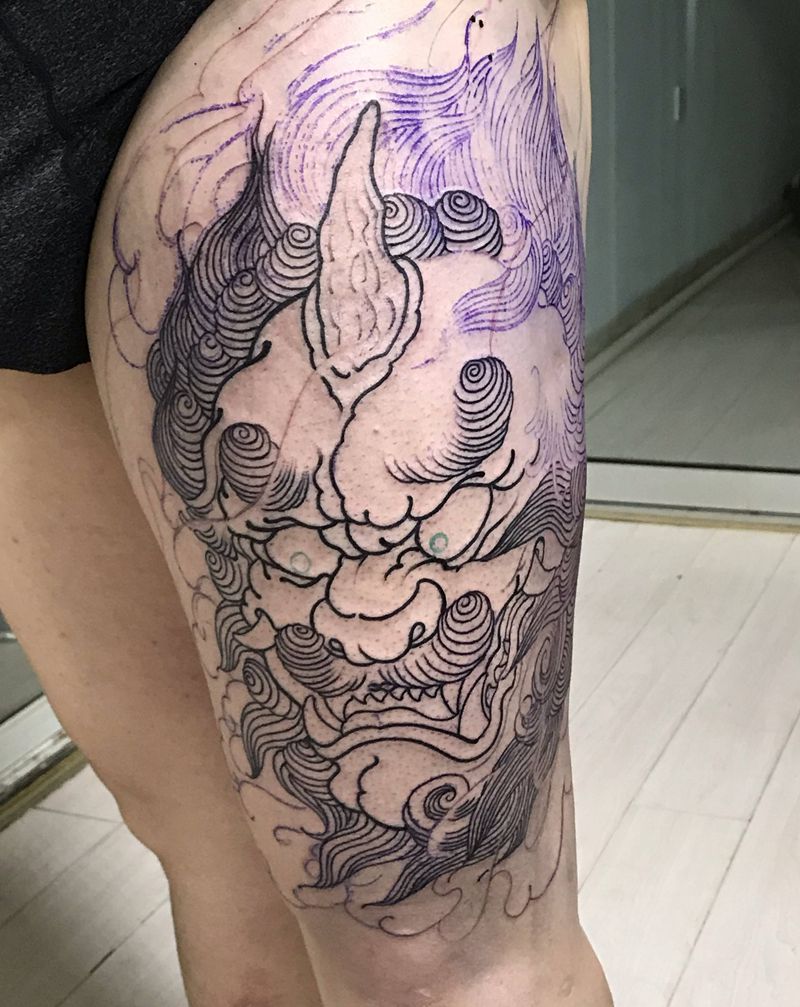 唐狮待续纹身图片_腿部新传统纹身图案