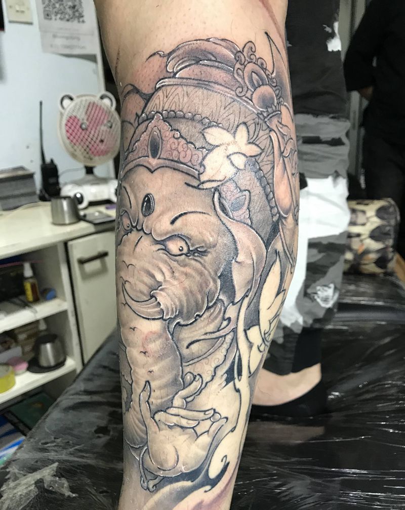 当前位置: 首页 >重庆市纹身店-北彫刺青纹身图案>小腿象神纹身图片_腿部纹身图案