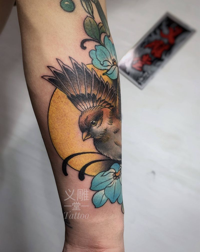 当前位置: 首页 >重庆市纹身店-义雕堂刺青纹身图案>New School麻雀纹身图片_手臂New School纹身图案