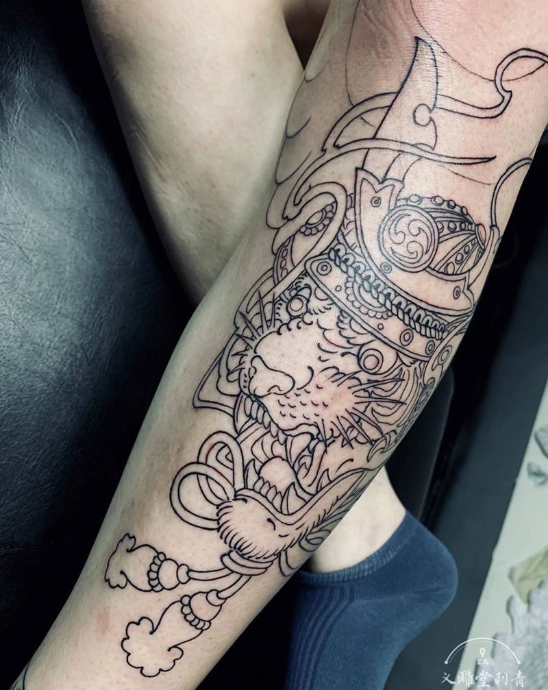武士虎割线完成纹身图片_腿部老传统纹身图案