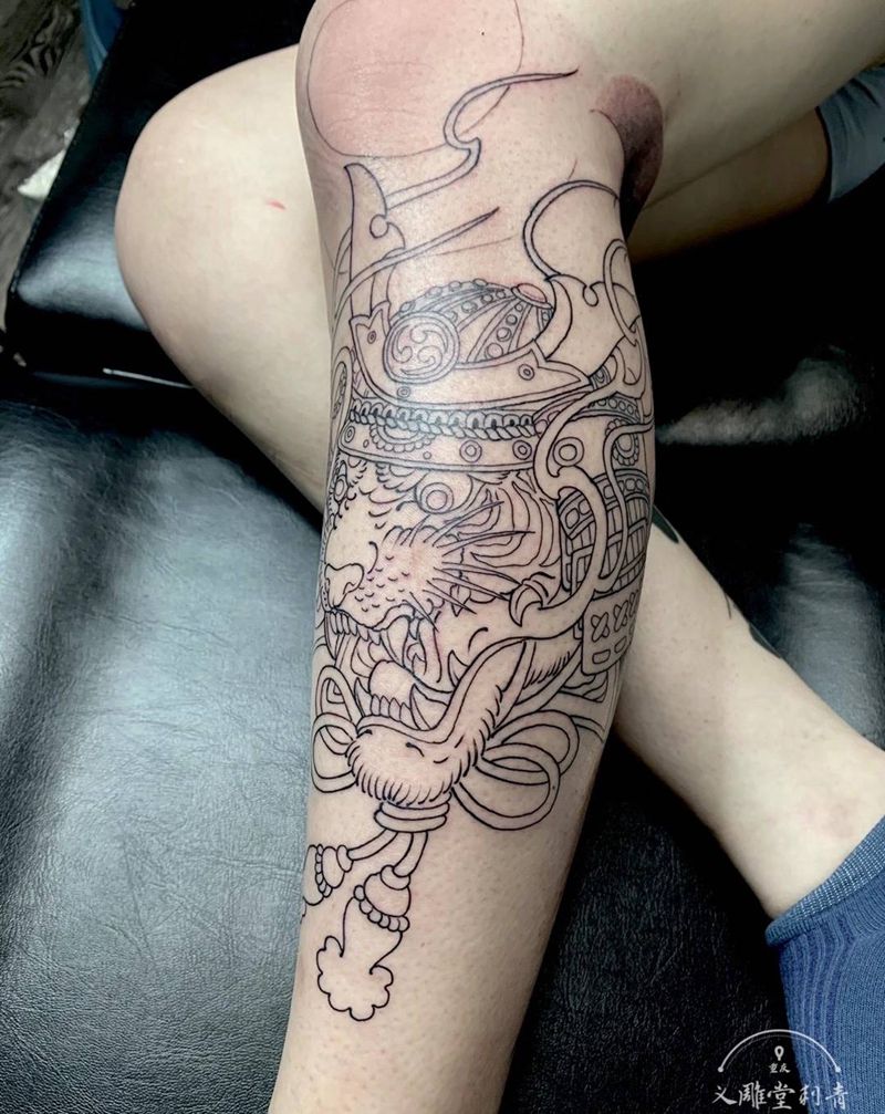 武士虎割线完成纹身图片_腿部老传统纹身图案