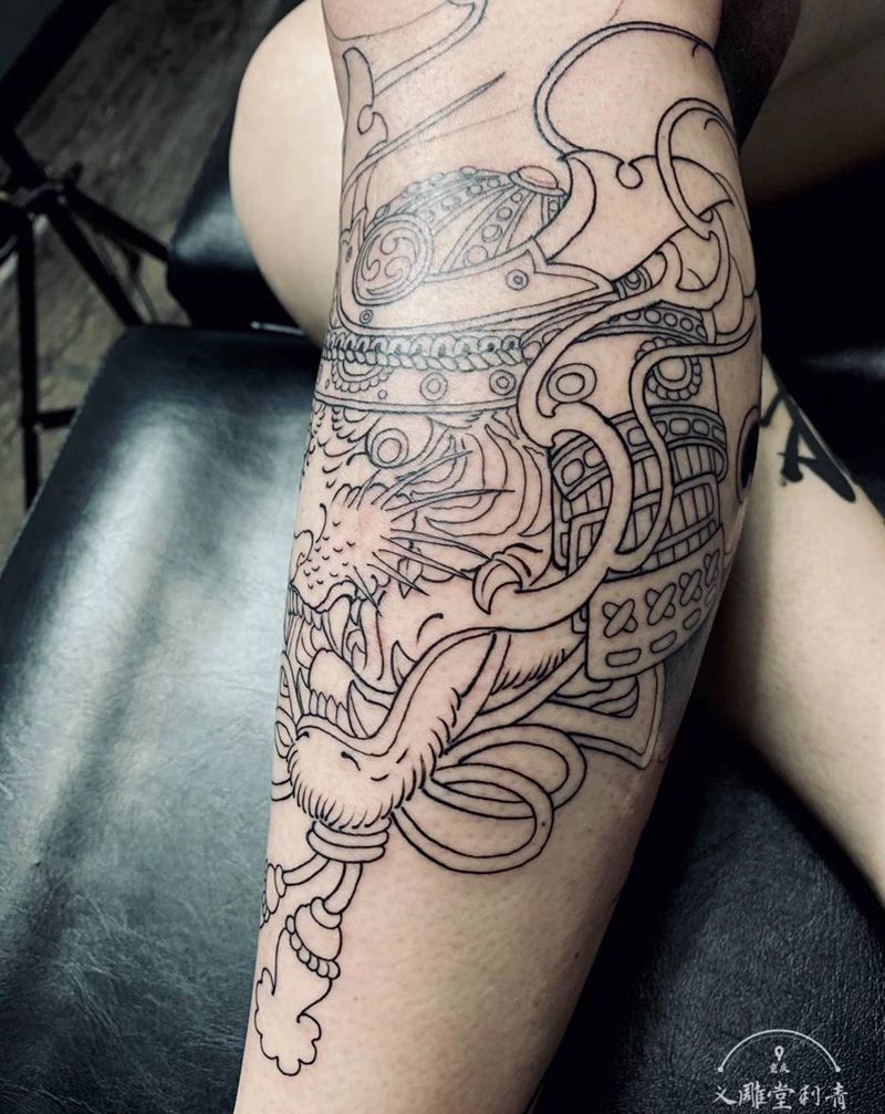 武士虎割线完成纹身图片_腿部老传统纹身图案