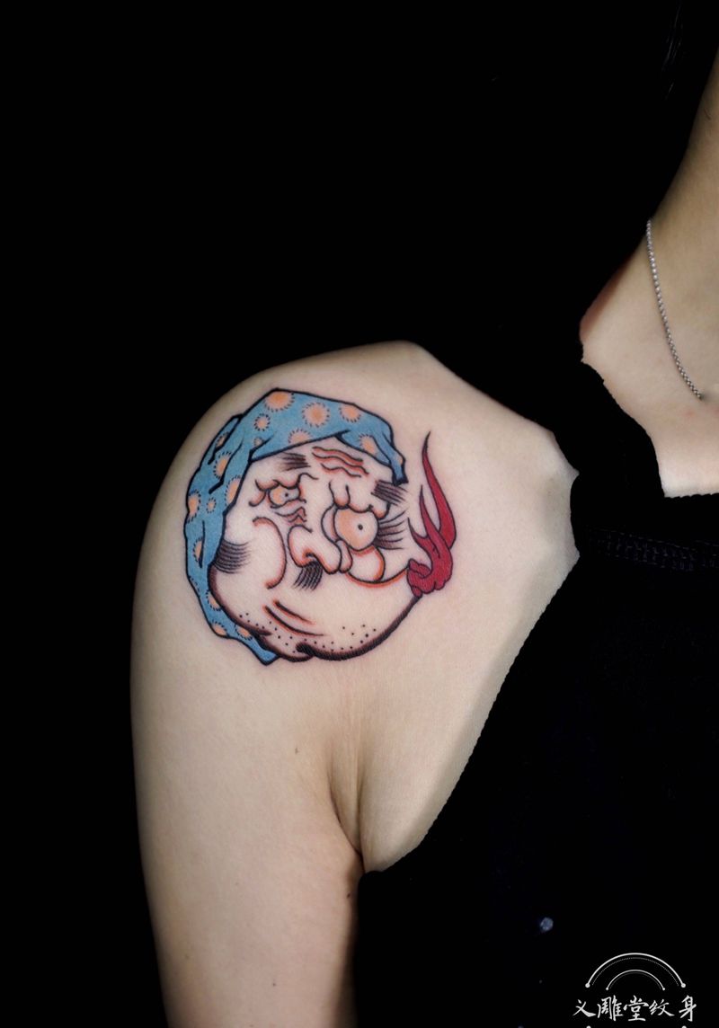 火男与阿多福纹身图片_肩部老传统纹身图案