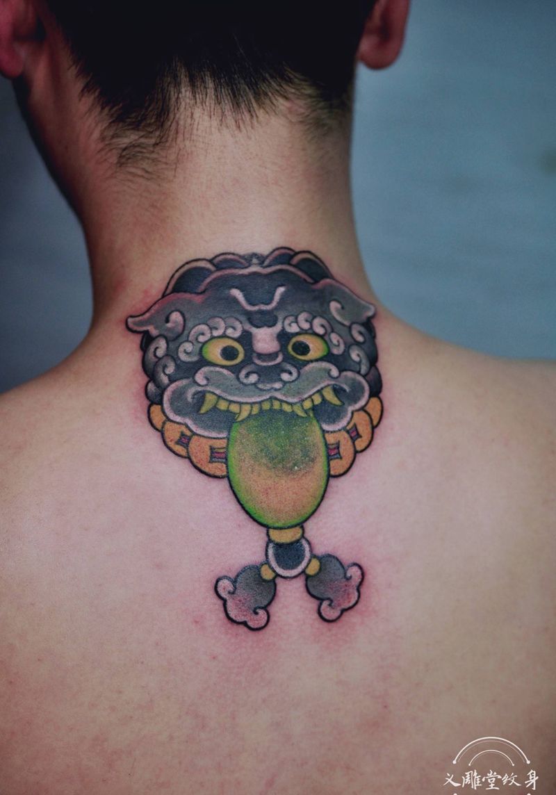后颈狮子头遮盖纹身图片_颈部老传统纹身图案