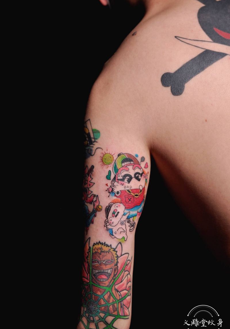当前位置: 首页 >重庆市纹身店-义雕堂刺青纹身图案>动漫人物拼接花臂纹身图片_手臂卡通动漫纹身图案