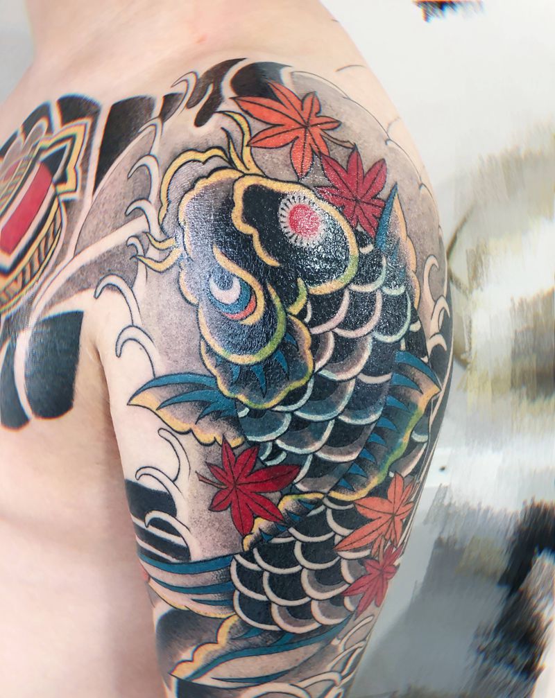 半胛遮盖纹身图片_手臂胸部老传统鱼 遮盖纹身图案