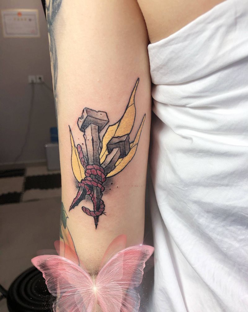当前位置: 首页 >重庆市纹身店-妙颜刺青纹身图案>铆钉纹身图片_手臂Old School老传统铆钉老传统纹身图案