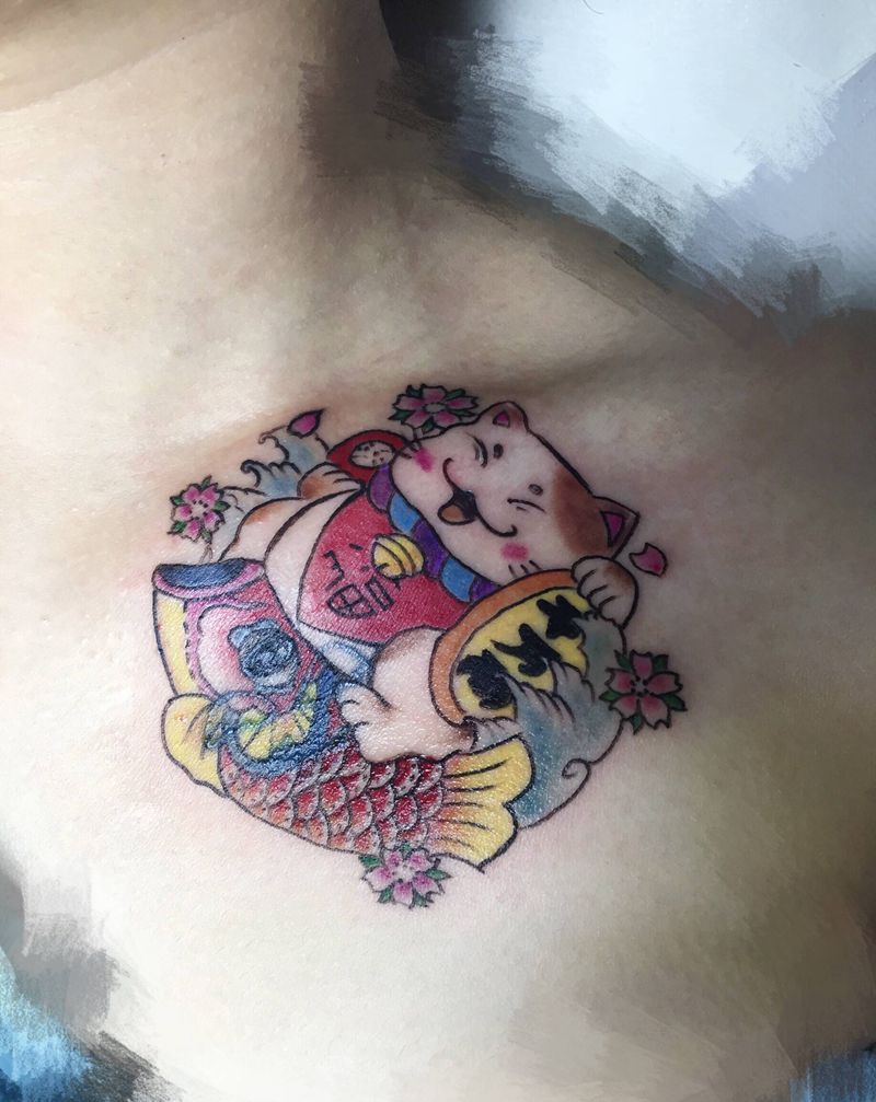 当前位置: 首页 >重庆市纹身店-妙颜刺青纹身图案>招财猫遮盖纹身图片_颈部胸部新传统New School纹身图案