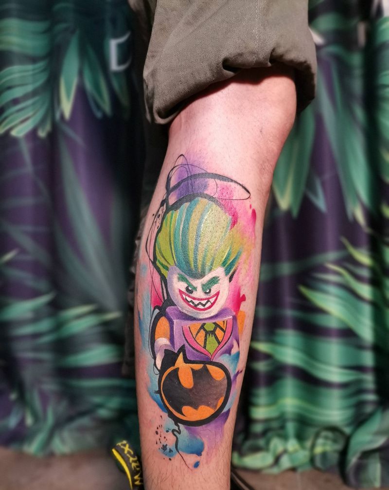彩色乐高小丑纹身图片_腿部水彩小丑彩色水彩蝙蝠纹身图案