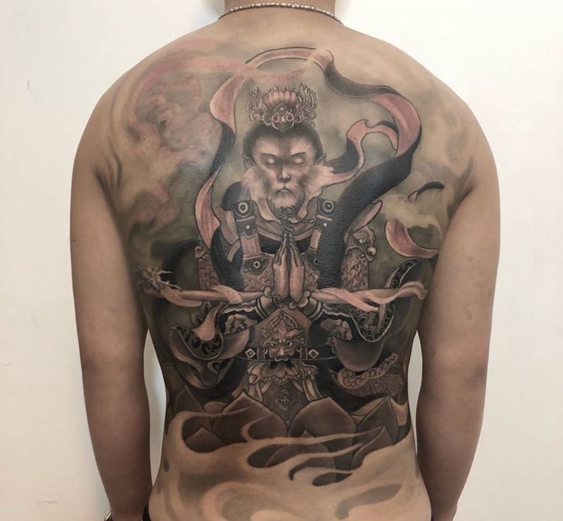 斗战佛纹身图片_成品背部传统人物鬼神动物纹身图案