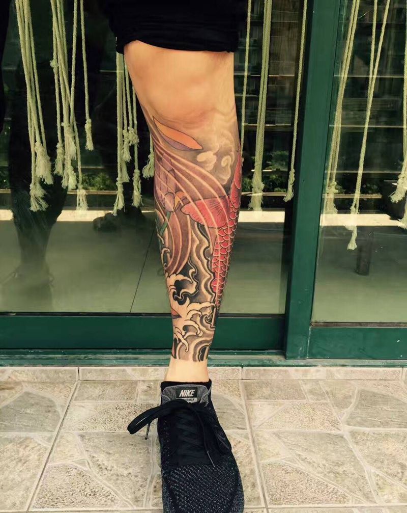 鲤鱼包小腿纹身图片_成品手臂腿部背部传统纹身图案
