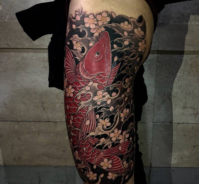当前位置: 首页 >重庆市纹身店-重庆梓刺青纹身图案>鲤鱼纹身图片_成品腿部臀部传统植物动物纹身图案
