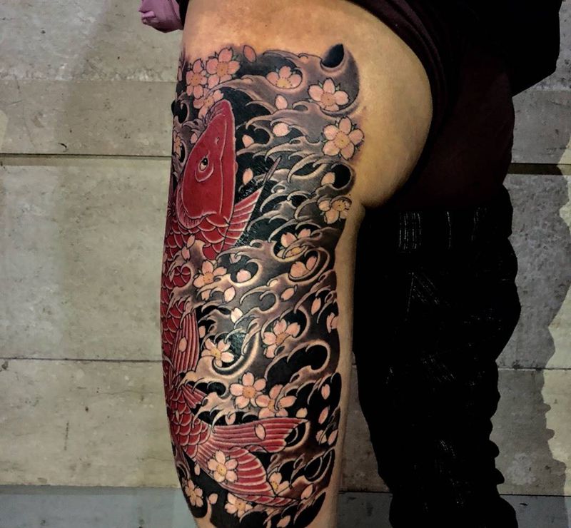 鲤鱼纹身图片_成品腿部臀部传统植物动物纹身图案