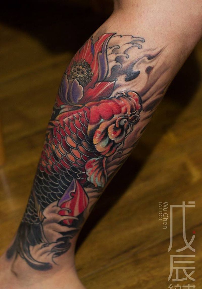 锦鲤遮盖纹身图片_成品腿部传统动物彩色水彩刺秦锦鲤刺青锦鲤日式鲤鱼纹身图案