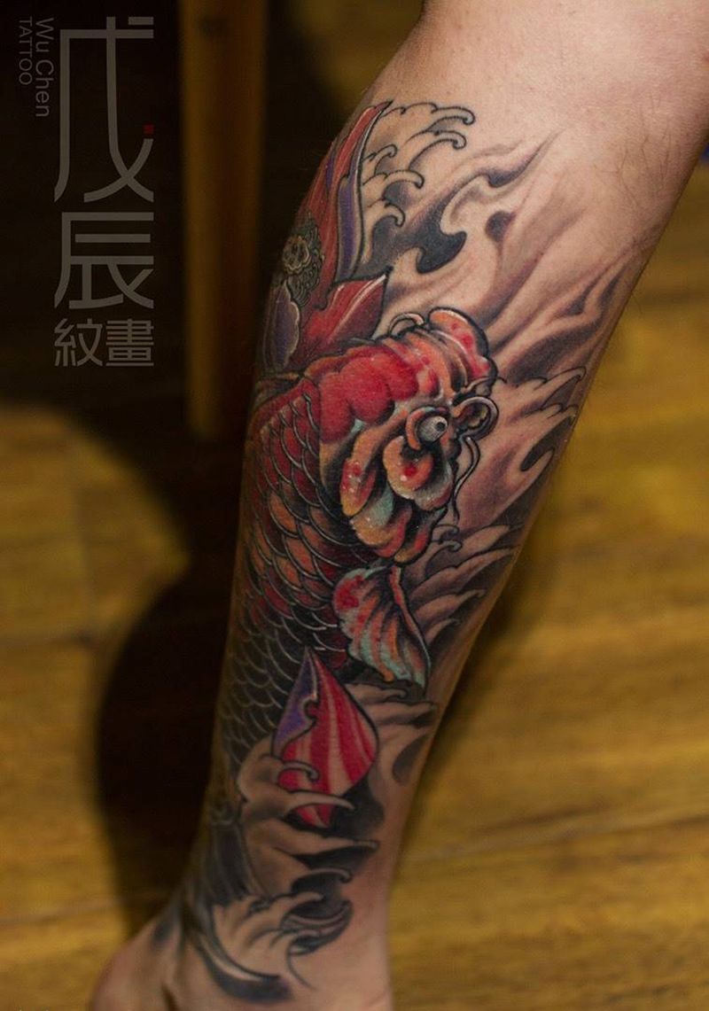 锦鲤遮盖纹身图片_成品腿部传统动物彩色水彩刺秦锦鲤刺青锦鲤日式鲤鱼纹身图案