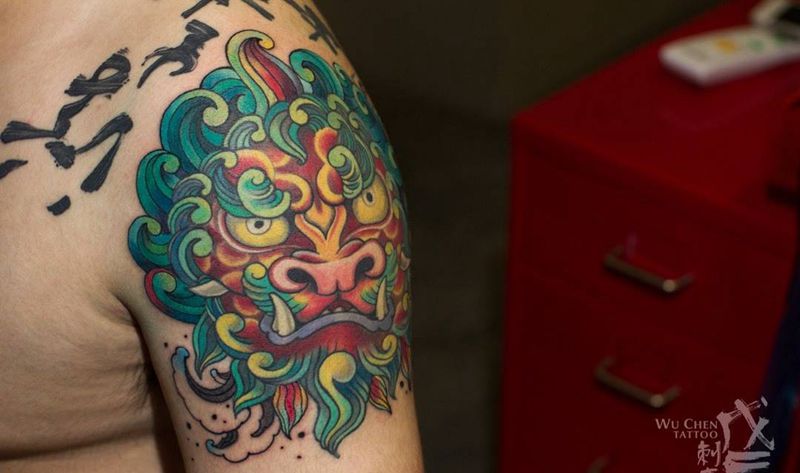 唐狮子纹身图片_成品肩部欧美传统动物重庆刺青水彩彩色唐狮子日式纹身图案
