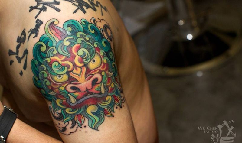 唐狮子纹身图片_成品肩部欧美传统动物重庆刺青水彩彩色唐狮子日式纹身图案