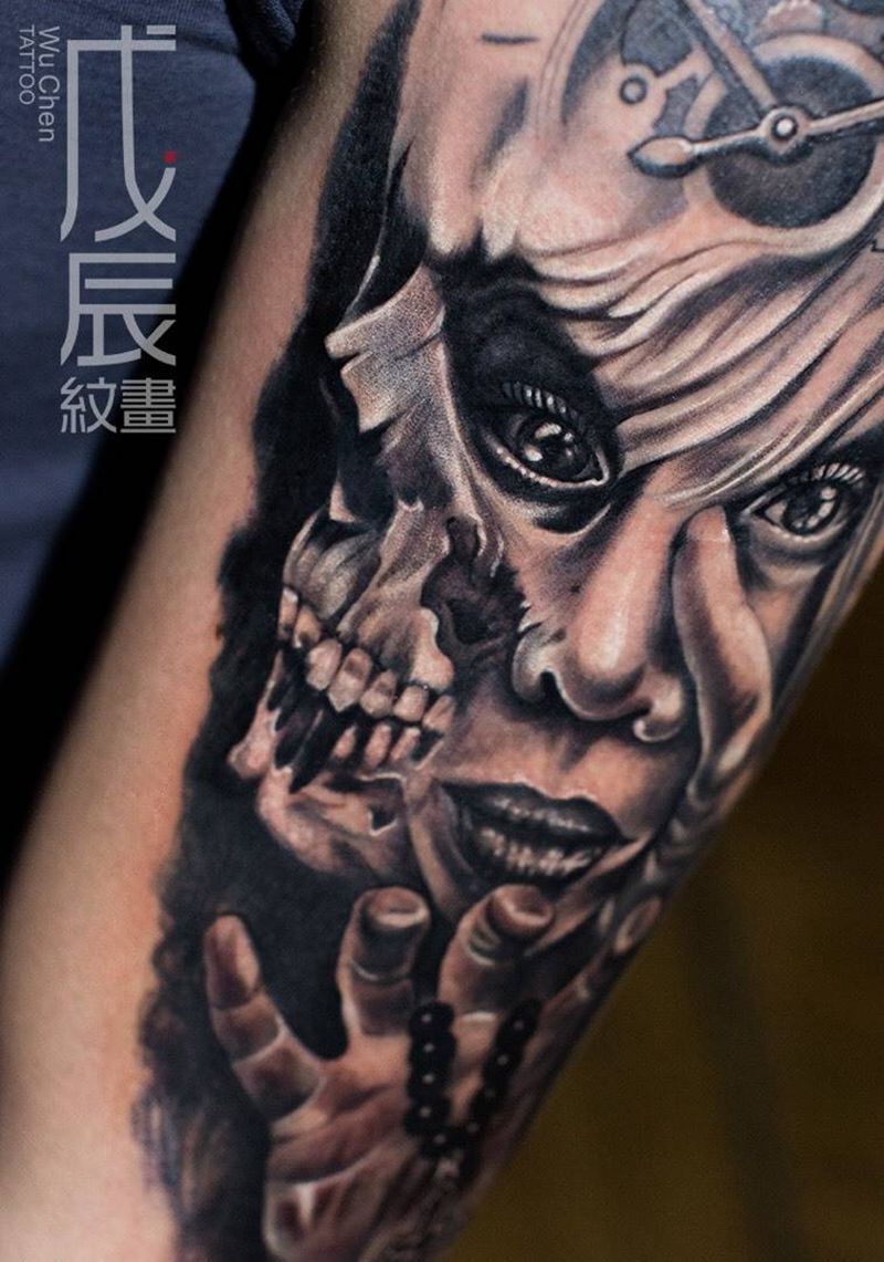 幻灭纹身图片_成品手臂欧美写实人物素描素描刺青欧美刺青设计纹身图案
