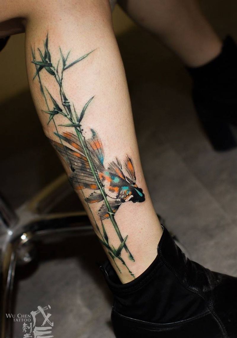 飞鸟与鱼纹身图片_成品腿部清新国画传统植物水彩刺秦水彩彩色水墨纹身图案