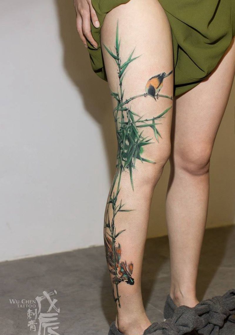 当前位置: 首页 >重庆市纹身店-戊辰刺青纹身图案>飞鸟与鱼纹身图片_成品腿部清新国画传统植物水彩刺秦水彩彩色水墨纹身图案