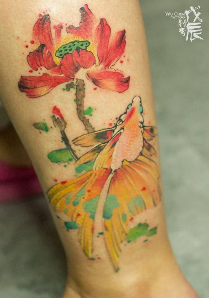 当前位置: 首页 >重庆市纹身店-戊辰刺青纹身图案>溪涧纹身图片_成品腿部传统国画动物水彩刺秦水彩彩色刺青金鱼纹身图案