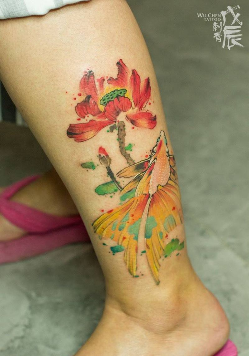当前位置: 首页 >重庆市纹身店-戊辰刺青纹身图案>溪涧纹身图片_成品腿部传统国画动物水彩刺秦水彩彩色刺青金鱼纹身图案