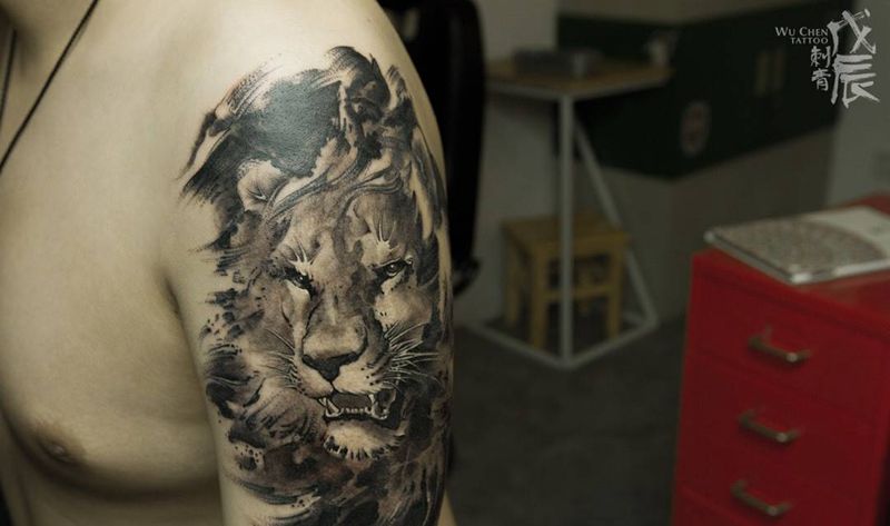 墨狮纹身图片_成品手臂传统国画狮子纹身图案